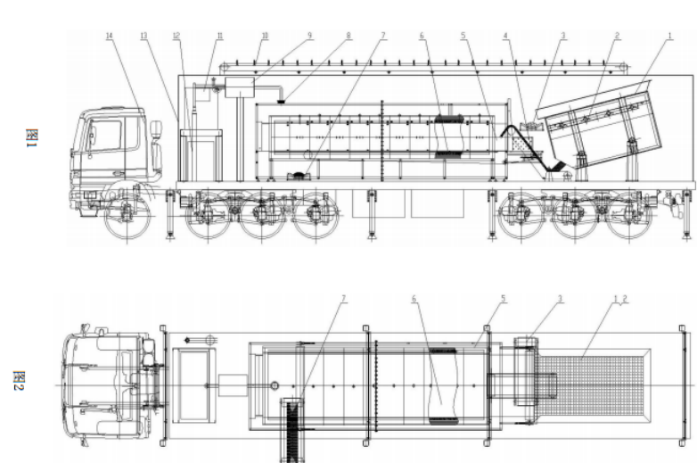 图中:1、筛选机,2、破碎机,3、传送带,4、倾角输送带,5、热脱附设备,6、热脱附机中的输送系统,7、可折叠式水平输送带,8、可更换式耐高温过滤网,9、二燃室,10、车载输送系统,11、监控系统,12、车载配电系统,13、车箱,14、运输车。